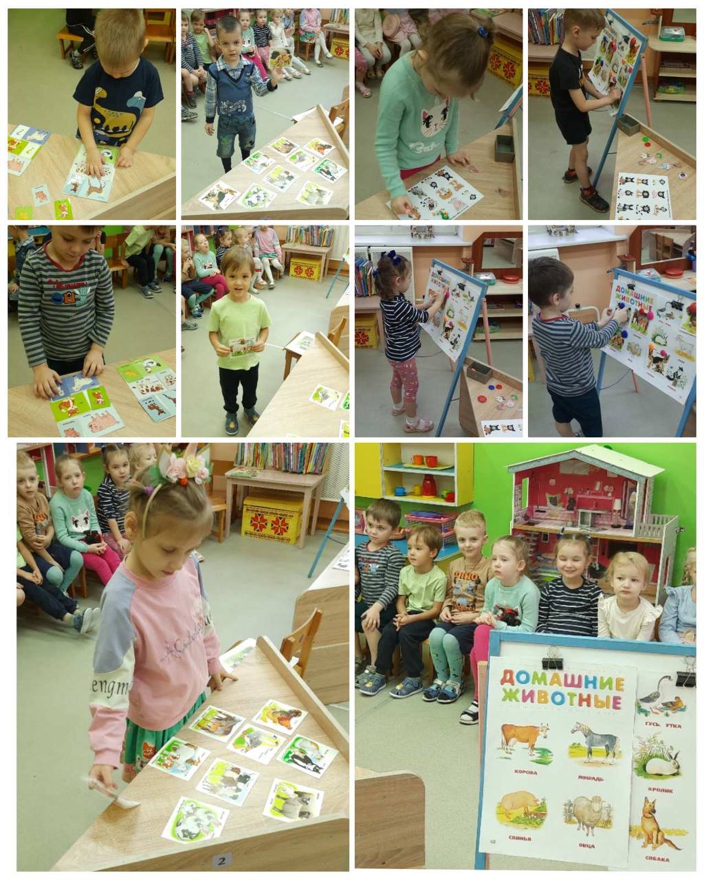 2.Формировать представления о правилах взаимодействия с домашними животными в помещении, развивать умение распозновать и группировать их (взрослые и детёныши), воспитывать интерес к домашним животным.