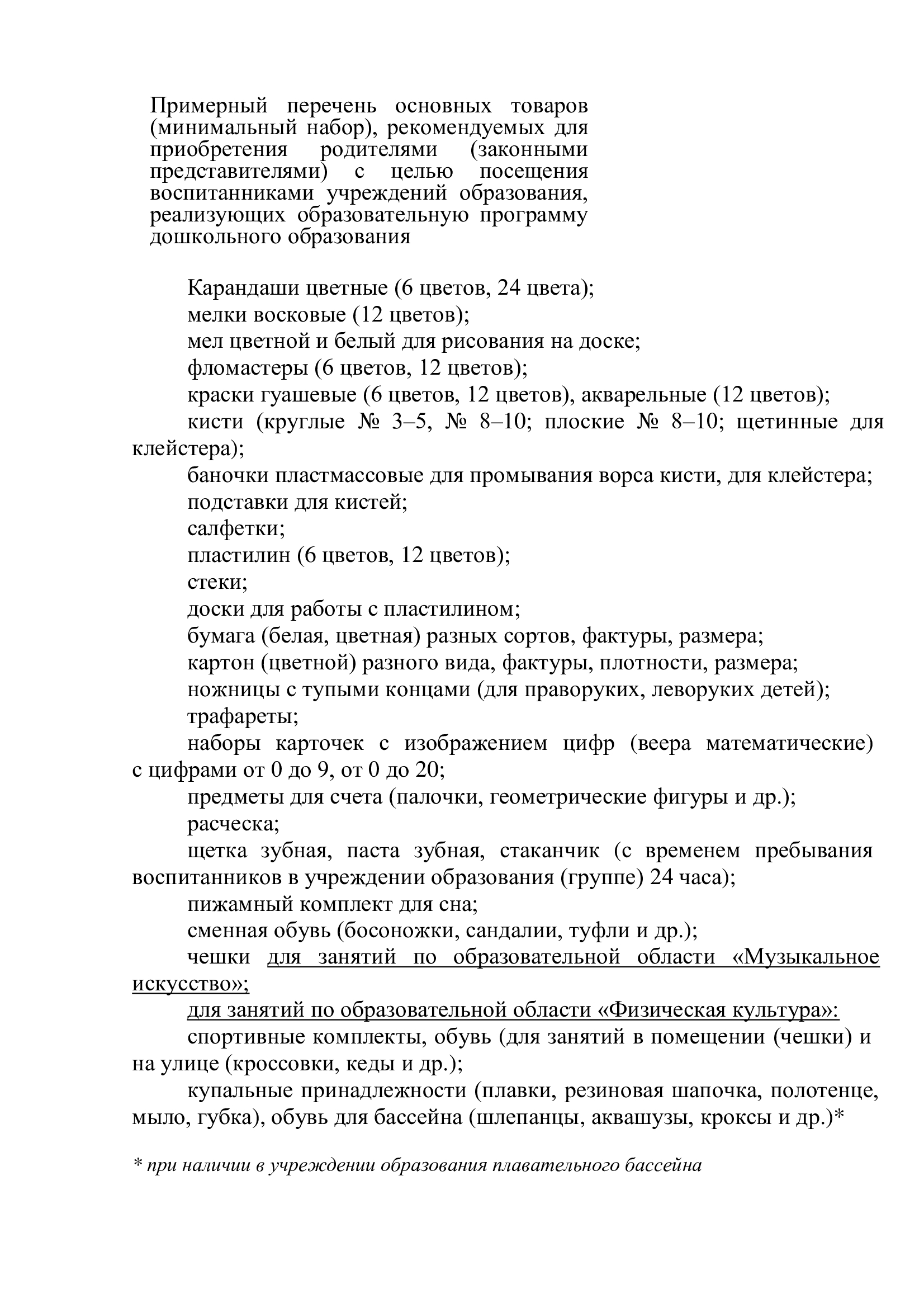 Примерный перечень основных товаров (минимальный набор), рекомендуемых для приобретения родителями (законными представителями) с целью посещения воспитанниками учреждений образования, реализующих образовательную программу дошкольного образования